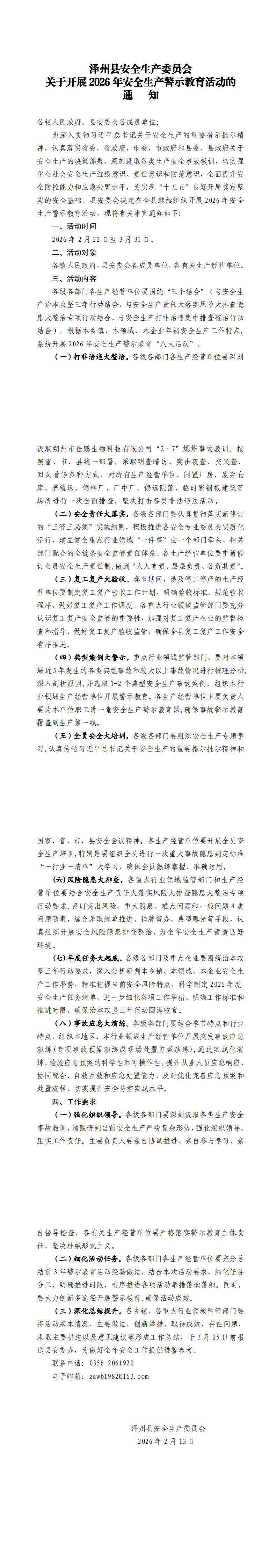 泽州县安全生产委员会 关于开展2026年安全生产警示教育活动的通知